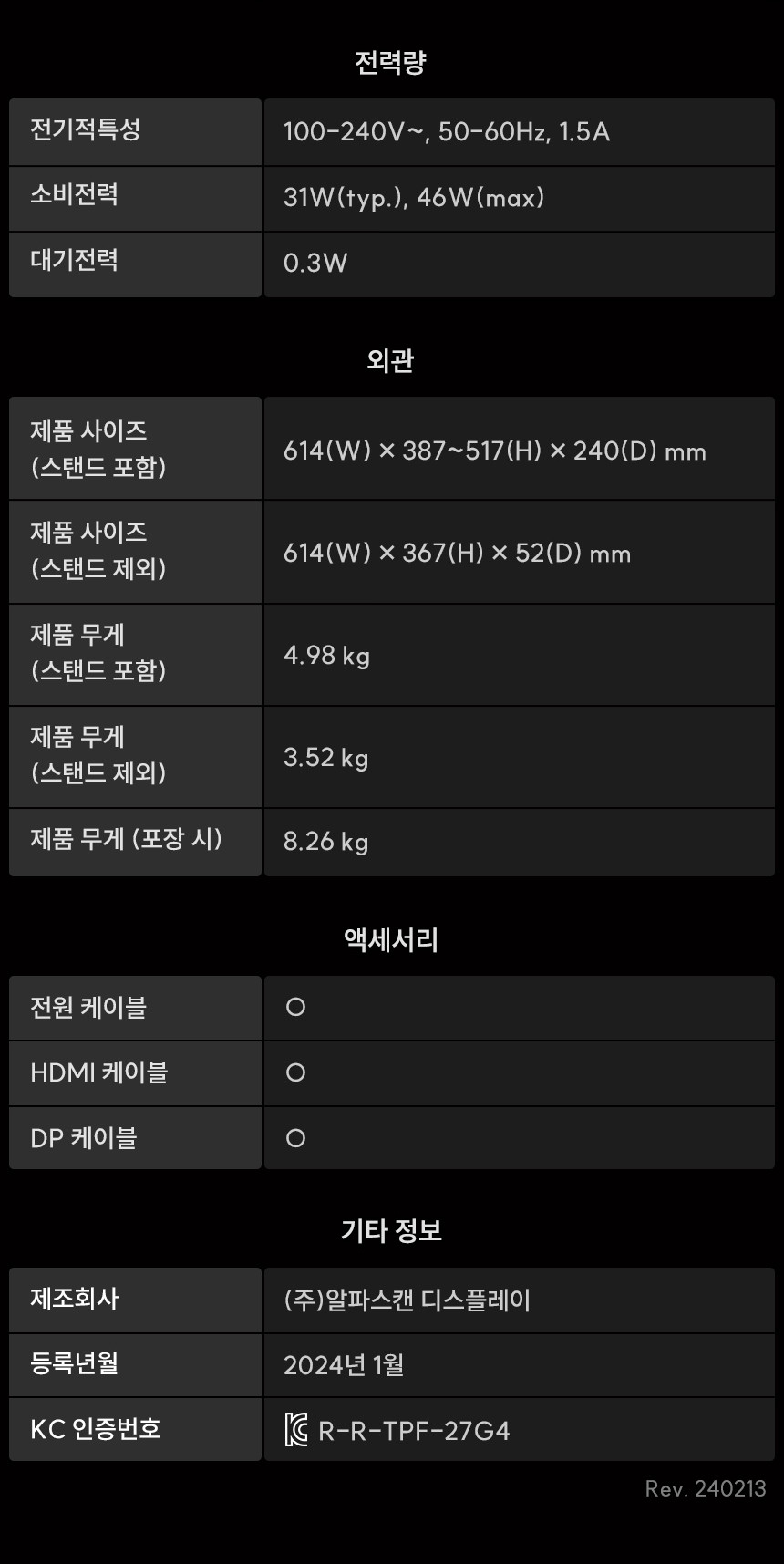 | KCC 인증 필 유무 | 상품페이지 참고 |